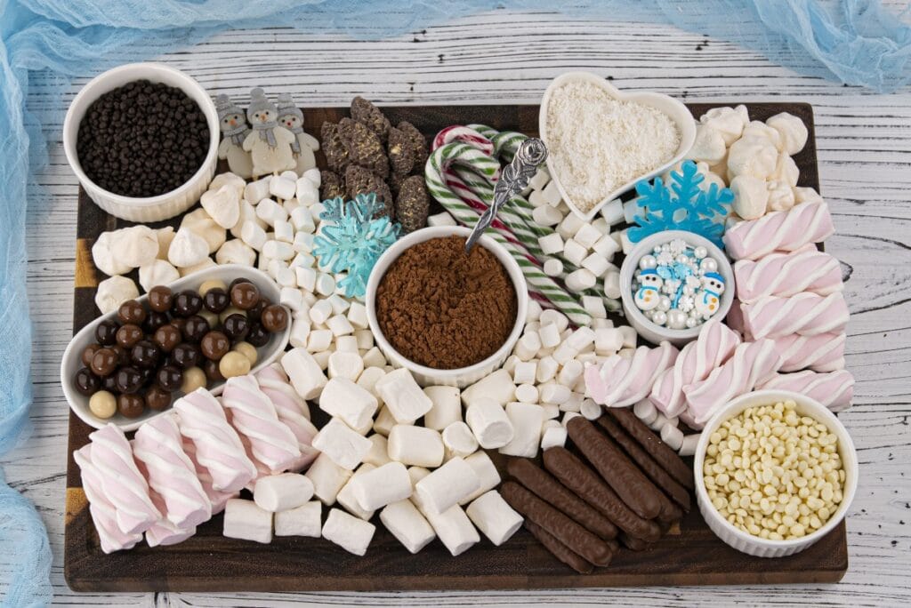 Themed candies – This hot chocolate charcuterie board is ready for Christmas with its snowflake candies, snowman candies, candy canes, and snowflake sprinkles.